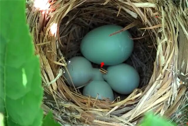 雌布谷鸟急不可待,立马飞了过去,见窝里有鸟蛋以后,就趁人家黄莺不在家,急忙从窝里挑一枚蛋,一脚踹出窝去,然后把自己的蛋偷偷产在巢穴中。布谷鸟只在这个巢穴里下一枚蛋,然后迅速逃离,这一过程十分完美,还不到半分钟。
