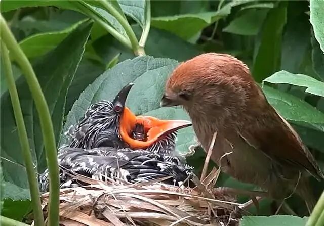 由于个头比养父母的幼鸟大数倍,为了争取到足够食物,小布谷鸟就模仿小伯劳的鸣叫声来乞食,希望蒙骗养父母多给自己带回来食物。