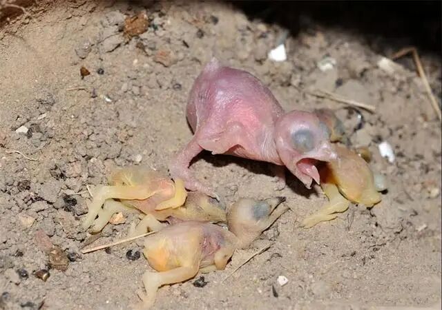 布谷鸟蛋的孵化周期要比伯劳的要短,而且雏鸟发育特别快。布谷鸟的雏鸟往往是第一个被卵化的,它一破壳,眼睛还没来得及睁开,肉色的身体还没长毛,本能就驱使这小家伙开始实施“排外策略”,只见它跌跌撞撞地把巢里的伯劳蛋一个接一个地挤出去,最后只剩下2个。