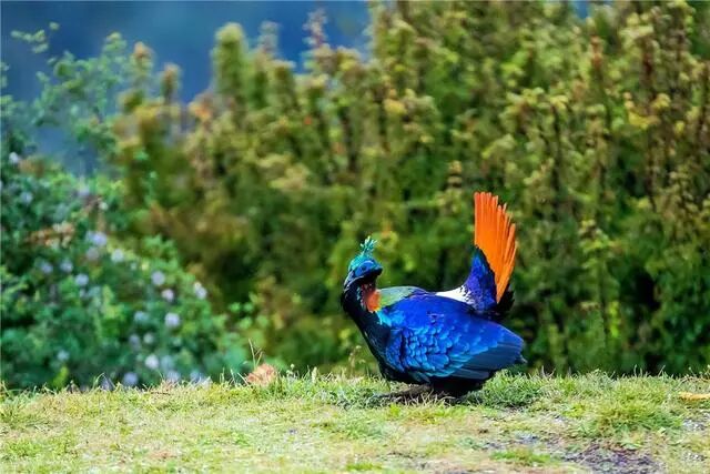 九色鸟就是棕尾虹雉,生活在卡久寺四周的高山,终年有云雾萦绕,偶尔会出现在卡久寺附近觅食、跳舞。头顶蓝绿色羽冠,身披彩虹般绚丽的羽毛,棕色的尾巴像一把漂亮的羽扇。