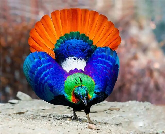 01头顶蓝绿色羽冠,身披彩虹般绚丽的羽毛,18枚尾羽如扇子