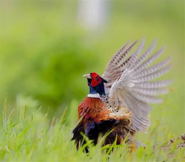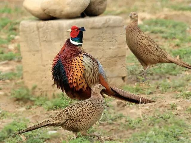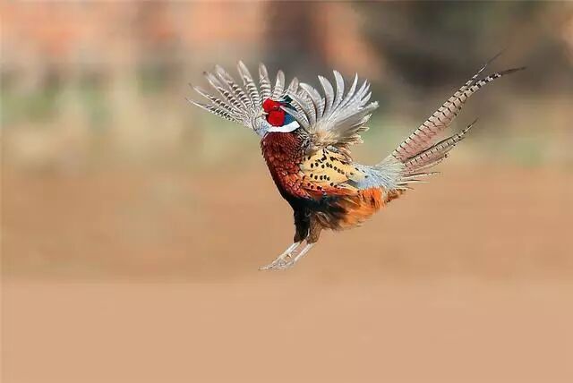 到了繁殖季,雄性环颈雉身上的羽毛丰满而艳丽,雄鸟为了吸引雌鸟,喜欢站在土坡、石头或较高的地方,高声鸣叫,翘起尾巴,同时振翅炫舞,色彩艳丽,姿态也十分优美。