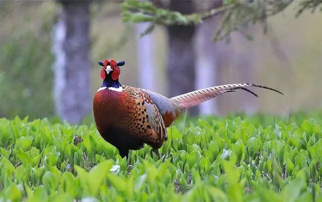 赢得雌鸟青睐的环颈雉,姿态高昂,尾羽竖直,头部冠羽竖起,仿佛打了胜仗的将军,沾沾自喜。