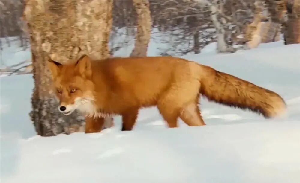 红狐好不容易发现猎物,当然不可能就此放弃,但也没有急于出手捕猎,而是在后面紧紧追赶着,还试图从侧面包抄。