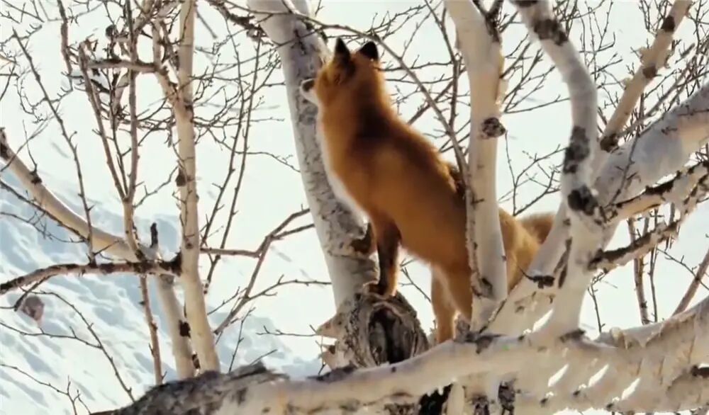 红狐越来越近了,突然跳跃而起,想要扑倒雷鸟。雷鸟惊叫出声,同时惊飞,被抓掉了几根羽毛,好险!雷鸟跑到光秃秃的树林下,急忙飞到树上,沿着树枝逐步爬到树顶上。