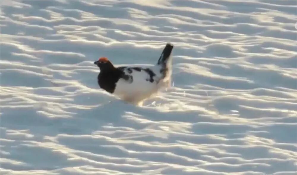 白茫茫的雪地里,雷鸟一身的羽毛,半白半黑,还挺显眼的。唉!都怪冬天来得太快,就连换羽速度很快的雷鸟,都还没来得及换上“冬装”。