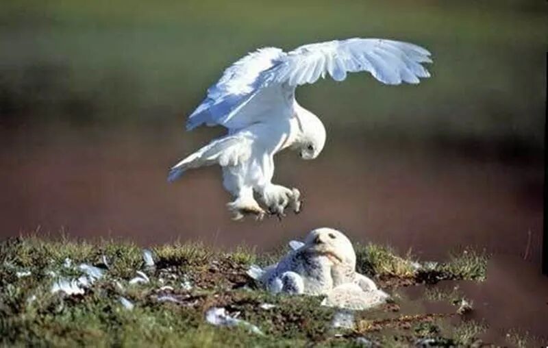 雪鸮从空中俯冲而下,袭击北极狐,预备用利爪去对付它。然而这只北极狐反应很灵敏,一下子躲开了,跑到一边去。