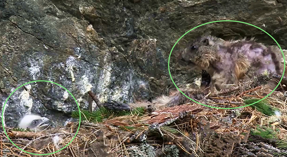 可是,金雕的巢穴建在几十米高的山崖上,旱獭就算跳下去也是一死。也不知道旱獭是害怕,还是伤重,动不了了,就一直趴在边上。