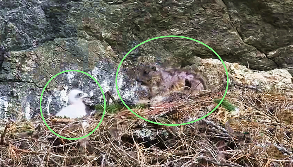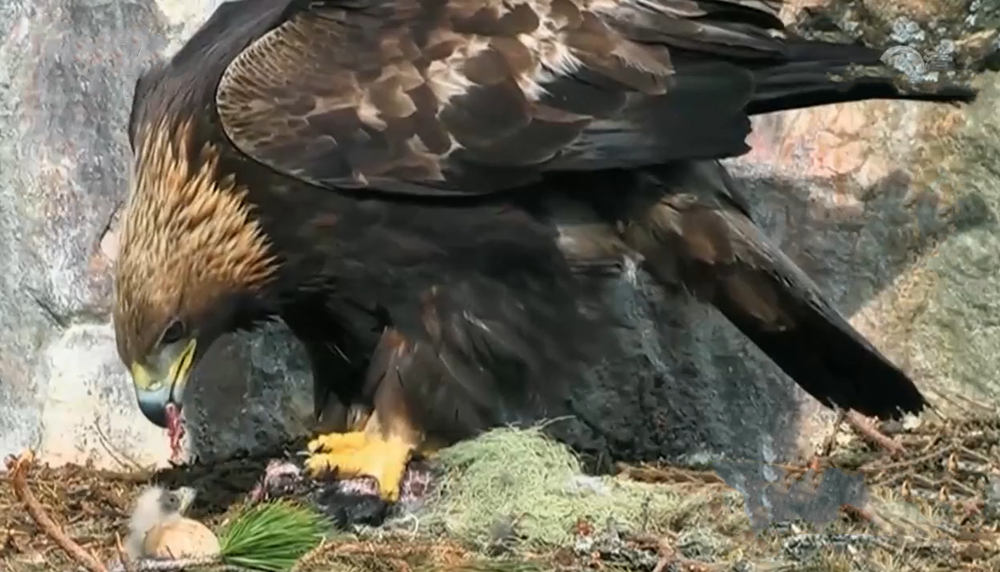 忙活了好一阵子,终于喂饱小金雕了,雌金雕把其余的食物都吃掉。守在巢穴里,等着金雕爸爸回来。