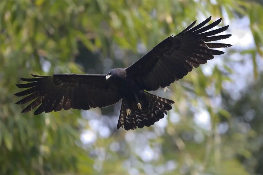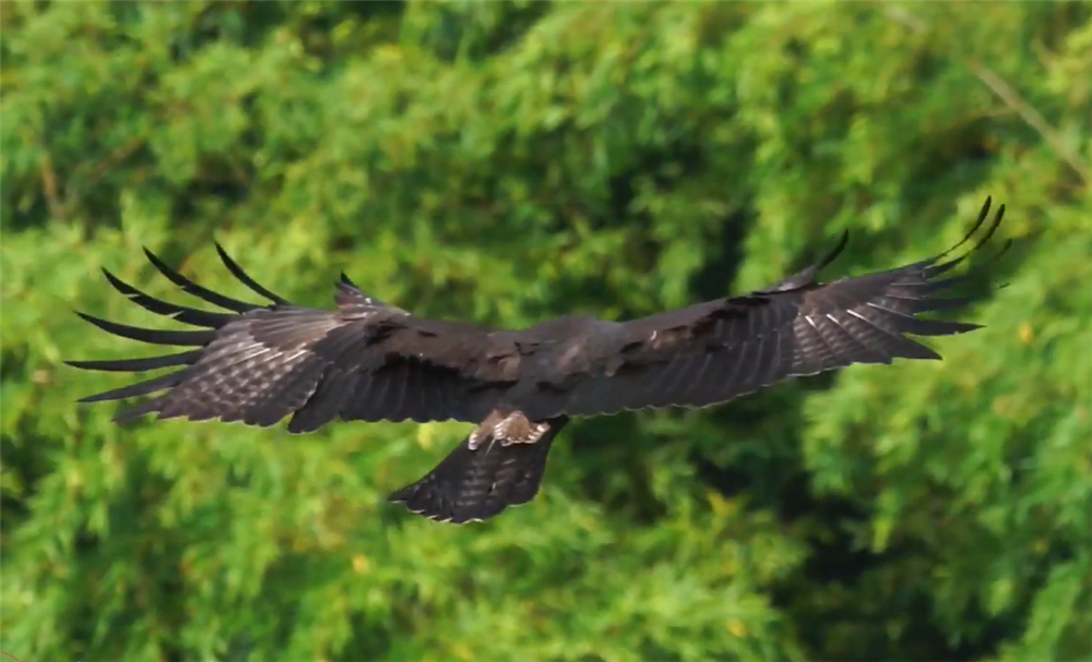 林雕又叫树鹰,通体黑褐色。在猛禽家族里,林雕的体重偏轻,体重约1-1.6千克,但成鸟的翼展却能达到1.8米,尾羽也挺长,体型精瘦有力。