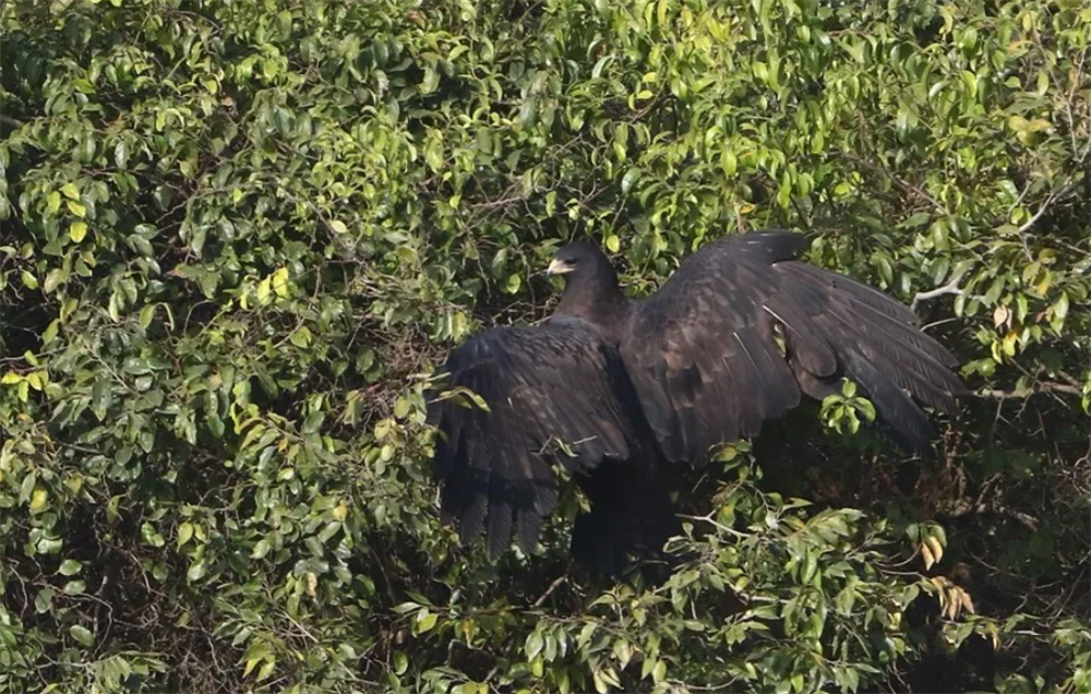 在密林里追捕猎物,林雕宽大的翅膀与长尾羽一不小心就被树枝剐蹭到。到了育雏后期,雄林雕的翅羽、尾羽磨损严重,看上去十分疲惫。