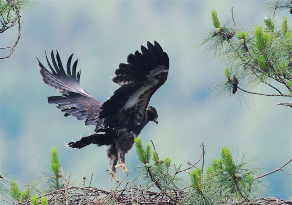 林雕只好扇动宽大的翅膀,重新飞到半空,继续寻找猎物。当它终于捕到一只鼯鼠回巢,嗷嗷待哺的幼鸟兴奋地叫了起来。