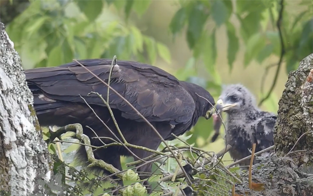 这之后的每一天,林雕爸爸不是在捕食,就是在赶去捕食的路上,一家三口的口粮都靠它去寻找呢。而林雕妈妈则要留守巢穴,看护幼鸟,以防被别的掠食动物抓去吃了。