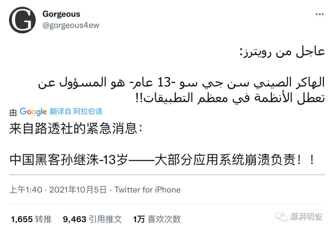 在脸书瘫痪的这六个小时里,舆论一片哗然,到底发生了什么才会导致如此大规模故障?在众多猜测声中,推特等海外社交平台上有账号援引所谓的路透社消息称,这一切都是一名叫做Sun Jisu的13岁中国小黑客的“杰作”,还有账号上传了所谓Sun Jisu的照片。
