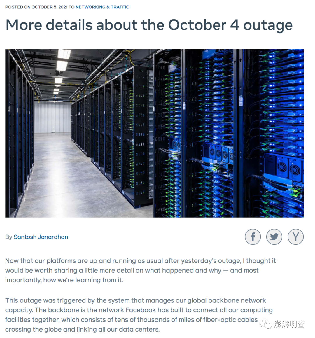 10月4日当天服务恢复后,脸书公司的基础设施副总裁桑托什·贾纳丹(Santosh Janardhan)发布声明表示,此次故障的根源在于例行维护工作中发出的一条错误指令,正是这条指令导致DNS服务器配置故障,切断了脸书骨干网络和数据中心之间的网络连接。