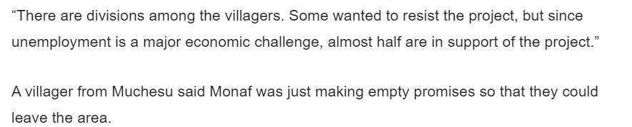 《每日新闻》援引宾加当地的活动家穆乔佩尼·穆丁巴(Mujopeni Mudimba)的话说:“由于经济方面的挑战,他们(莫纳夫)只在2010年进行了勘探,钻了样品孔,然后他们又回去了。现在,埃默森·姆南加古瓦(Emmerson Mnangagwa)总统的2030愿景,给他们的投资开了绿灯。去年10月,他们又回来了,重新开启了这个项目。”