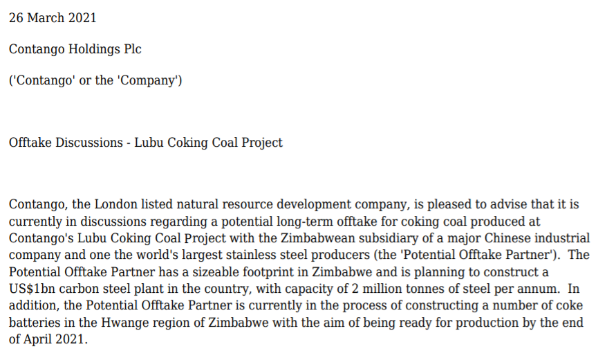 坎坦戈关于收购津巴布韦鲁布煤田的说明文件内容截图