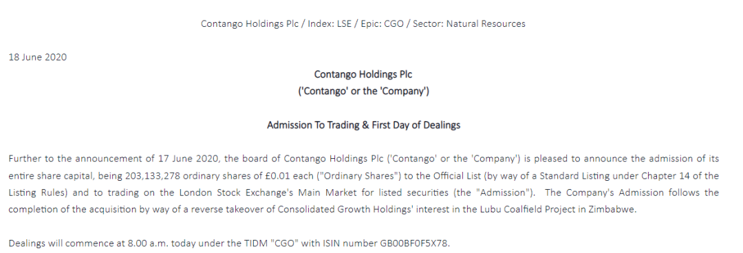 2020年6月18日,坎坦戈正式完成对鲁布煤田的收购,坎坦戈也以“CGO”为交易代码,重新获准在伦敦证券交易所上市。