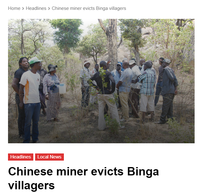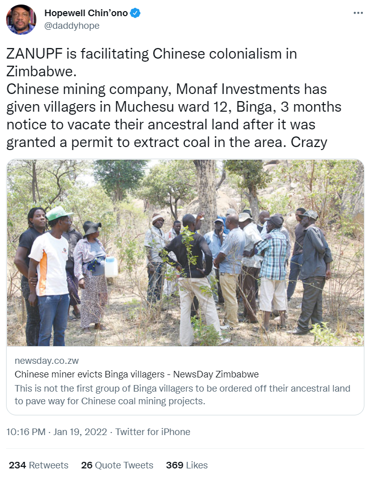1月19日,推特上流传一种说法称,中国矿业公司“莫纳夫投资”(Monaf Investments)通知宾加(Binga)穆切苏12区(Muchesu ward 12)区的村民在3个月内搬离他们祖祖辈辈生活的土地,以为将来的煤炭开采项目铺路。