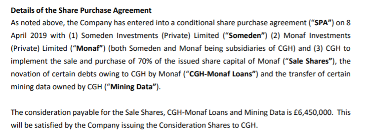 2019年4月,坎坦戈与CGH订立股票购买协议,以每股0.05英镑的价格向CGH发行1.29亿普通股,来支付645万英镑(折合人民币约5573.45万)的收购对价,达成反向收购。根据此次协议,坎坦戈共获得(a)CGH子公司莫纳夫70%的股份、(b)CGH向莫纳夫发行的集团内部贷款,以及(c)CGH的某些采矿数据。