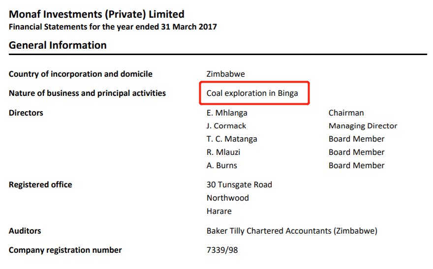 2017年莫纳夫公司财报将该公司的主要业务和商业活动定位为“宾加煤炭挖掘”。