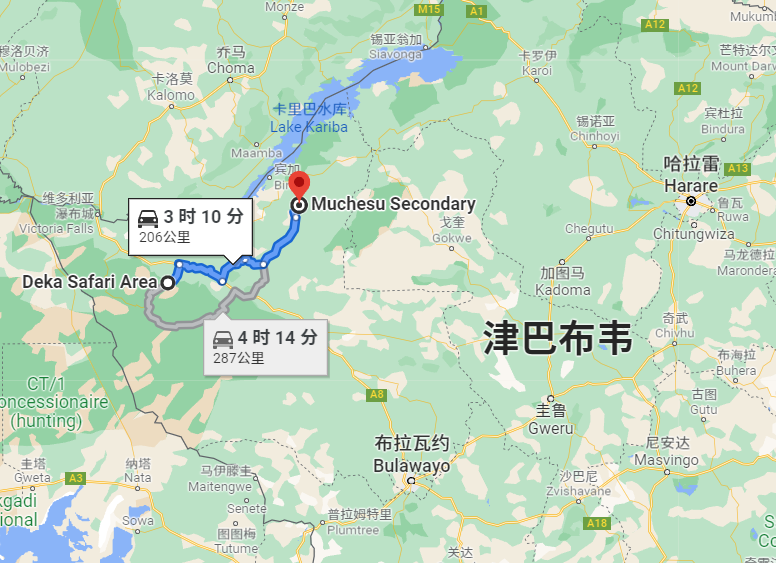 德卡野生动物园与穆切苏路线示意图。由于谷歌地图未收录“穆切苏”,图中目的地设置为更加具体的“穆切苏高级中学”。