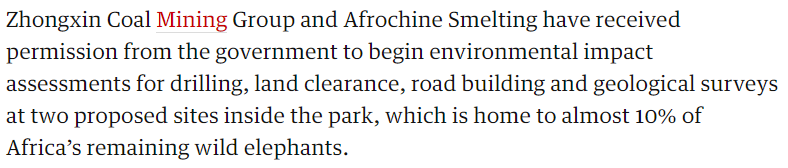 除此之外,中非冶炼和鼎森的主要业务均集中在铬矿开采,以及焦煤和碳钢炼制,对煤矿的勘探开采鲜有涉及。唯一的例外是,2020年9月,中非冶炼与另一家“中信焦化”在津巴布韦政府许可之下,在万基国家公园(Hwange National Park)筹备煤矿开采,对钻井、土地清理、道路建设和地质调查进行环境影响评估。