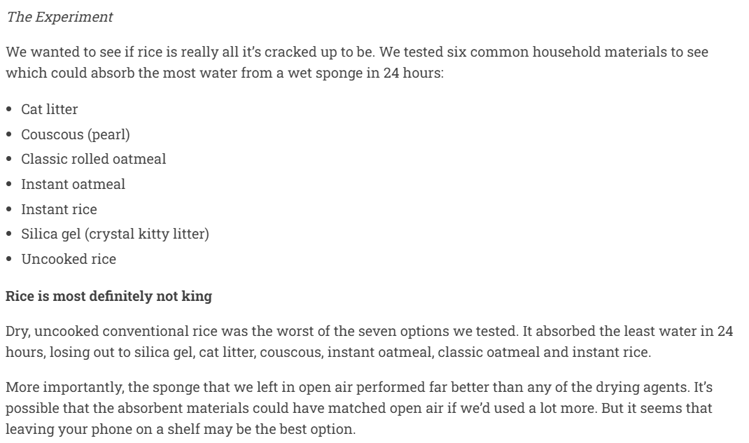 2014年,专注电子产品的二手交易网站Gazelle曾经做过一个实验,将吸了水的海绵分别放入猫砂、珍珠古斯米(pearl couscous)、经典燕麦片、即食燕麦片、即食米饭、硅胶和干燥生米中,观察后续海绵含水量情况。结果发现,7种材质中,干燥生米吸收水分的能力最差,而露天放置风干的效果要好过放以上这些“干燥剂”。