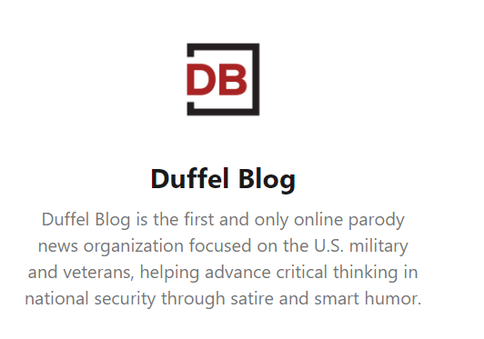 此外,达弗尔博客的主页,赫然几行大字介绍该网站性质:“达弗尔博客是第一个,也是唯一一个,聚焦美国军事和退伍老兵的线上戏仿新闻组织,通过讽刺和机智的幽默来帮助促进国家安全领域的批判性思考。”