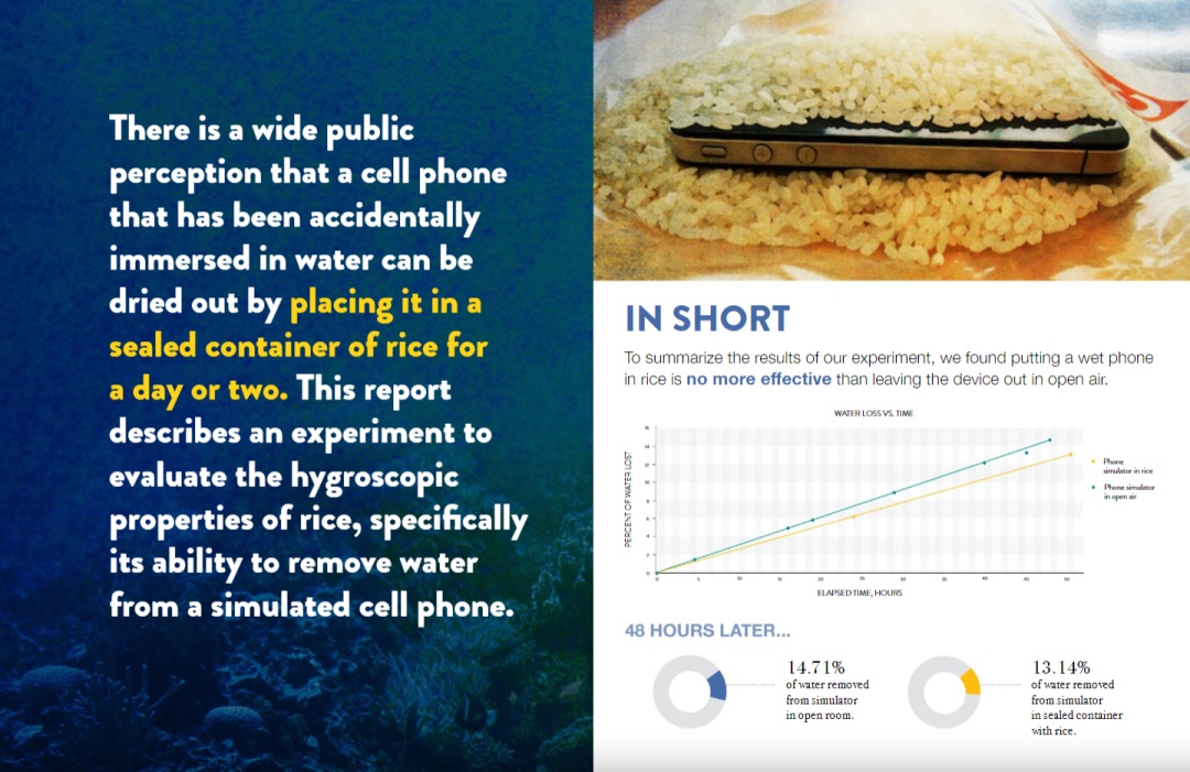 2017年,提供进水手机修理服务的公司TekDry委托DTJ咨询出产了一份关于大米吸水性的评估报告。课题组将进了水的模型手机分别放入装有约1磅米的容器中和21.5摄氏度的房间中进行风干,在24小时和48小时后对前者和后者进行称重。结果显示,用大米干燥与自然风干两种方法没有显著差别。