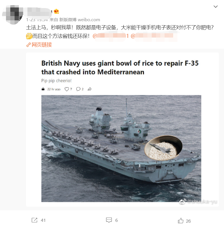 近日,有微博网友发布博文,附一篇文章截图,文章标题为“英国海军用一大碗米来修复坠入地中海的F-35”。网友表示,这种土法干燥“省钱又环保”。