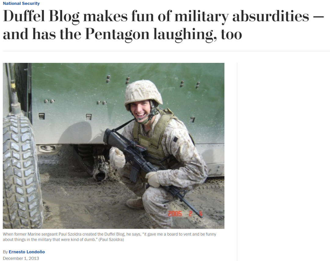 在一篇发布于2013年12月的报道中,《华盛顿邮报》称“达弗尔博客嘲笑军事的荒谬——也让五角大楼发笑”。