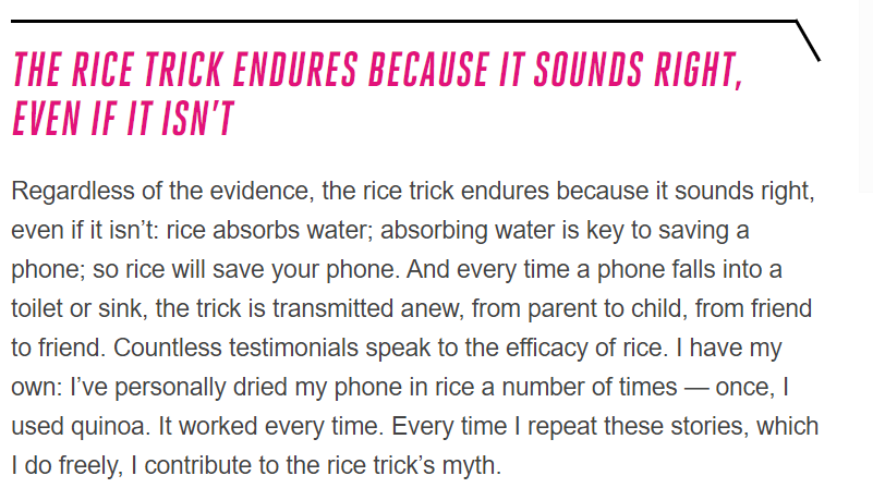 2015年,美国科技新闻网站The Verge在一篇名为《大米真的能拯救你的湿手机吗?》的文章中写道:“大米的把戏之所以能够经久不衰,是因为它听起来很真,即使它并不真。”这篇报道将“大米拯救进水设备”称为“迷思”。