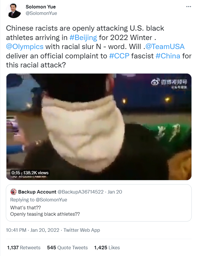北京冬奥会开幕在即。近日,推特上流传消息称,美国黑人运动员参加冬奥会抵达北京时,受到了中国种族主义者的公开侮辱。