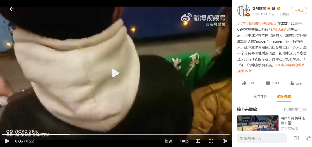视频的文字说明显示,“在2021-22赛季CBA常规赛第二阶段#辽粤大战#比赛结束后,辽宁球迷在广东男篮的大巴车前对着外援威姆斯大喊‘nigger’”。