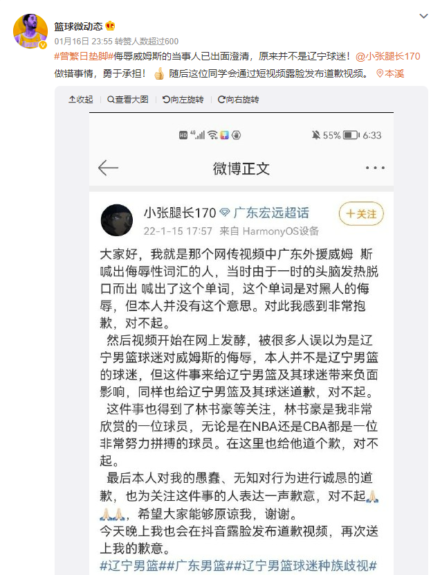 事件发酵后,1月16日,有微博账号发布截图称,视频中侮辱威姆斯的当事人已出面澄清,称自己不是辽宁队球迷,只是头脑发热喊出了侮辱性词汇,想要对威姆斯道歉。