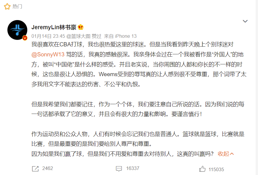 威姆斯被球迷围堵辱骂后,北京首钢队外援球手@JeremyLin林书豪在微博发布感想称:“Weems受到的辱骂真的让人感到很不受尊重,那个词带了太多我用文字不能表达的伤害、不公平和仇恨。”
