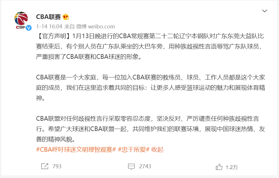 CBA联盟:“对任何歧视性言行采取零容忍态度,坚决反对、严厉谴责任何种族歧视性言行。”