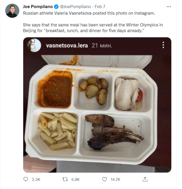 类似的手法也被另一名推特认证用户@JoePompliano所采用。此人在2月7日发文称,俄罗斯越野滑雪运动员瓦列里娅·瓦斯涅佐娃(Valeria Vasnetsova)在IG上发布了一张图片,显示的是瓦斯涅佐娃在北京冬奥期间连吃了5天的食物。