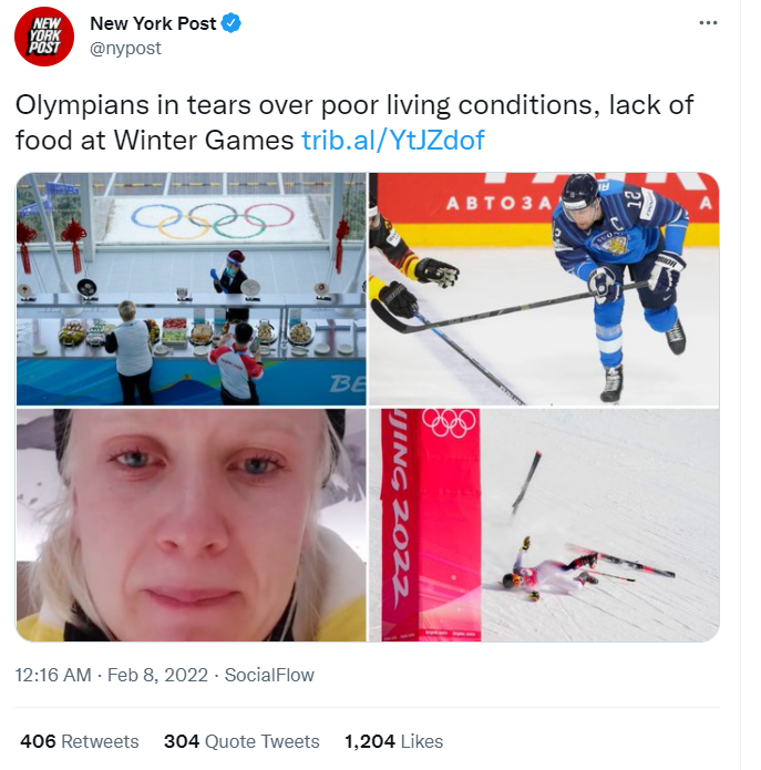国外社交平台上近日有消息称,北京冬奥的食宿条件不尽如人意。2月8日,美国知名小报《纽约邮报》在推特发布消息,称奥林匹克运动员正因居住条件差和缺乏伙食而哭泣。