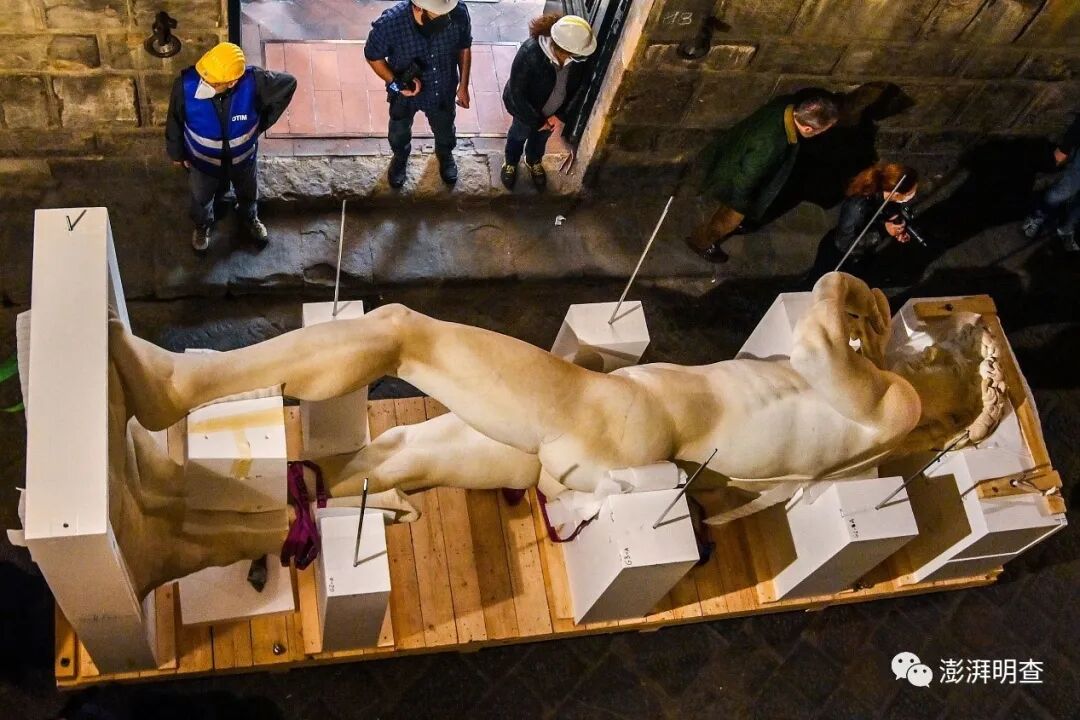 当地时间2021年4月14日,意大利佛罗伦萨,当地用3D打印技术制作的米开朗基罗的《大卫》雕像作品将被送走,参加阿联酋2020年迪拜世界博览会。