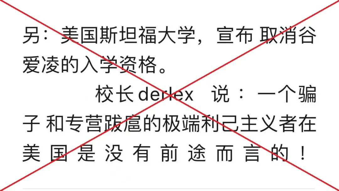 网传消息中称,“斯坦福大学校长derlex”将谷爱凌叫作“骗子”和“专营跋扈的极端利己主义者”。然而经查证,斯坦福大学官网校长信息页面显示,该校目前的校长名叫马克·特希尔-拉维尼(Marc Tessier-Lavigne),且斯坦福历史上从1891年至今履职的11任校长中,没有一位以“Derlex”为姓或名。