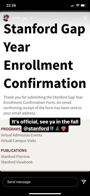 2020年12月,谷爱凌在Instagram(IG)上发布了一段视频,宣布自己被斯坦福大学录取。