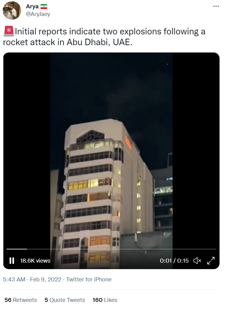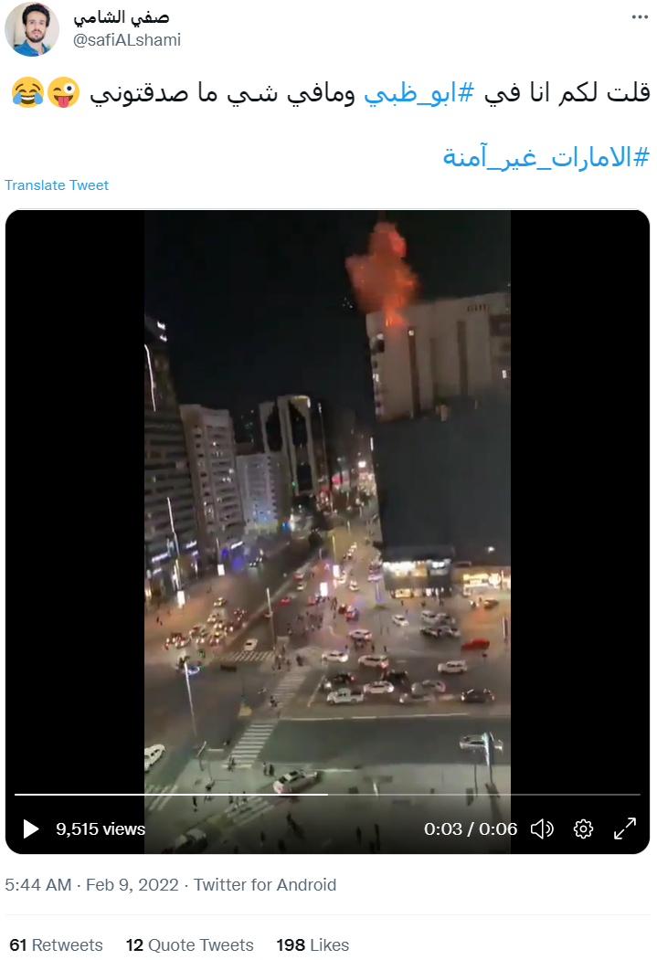 除此之外,鉴于以上消息集中发布于今年2月9日,“澎湃明查”在推特上用阿拉伯语搜索标签“#ابو_ظبي”(#阿布扎比),并将时间限定在今年2月9日。发现从另一个角度记录此次爆炸的视频。从这位名为@safiALshami的网友发布的视频中,可以明显看到爆炸后的一些细节——发生地并非建筑物天台楼顶,相反,火焰是从高层的一个窗口窜出后升空的。而无人机袭击直接从窗外往室内投掷爆炸物的可能性较低,因此,这则视频可以基本证伪Press TV的说法。