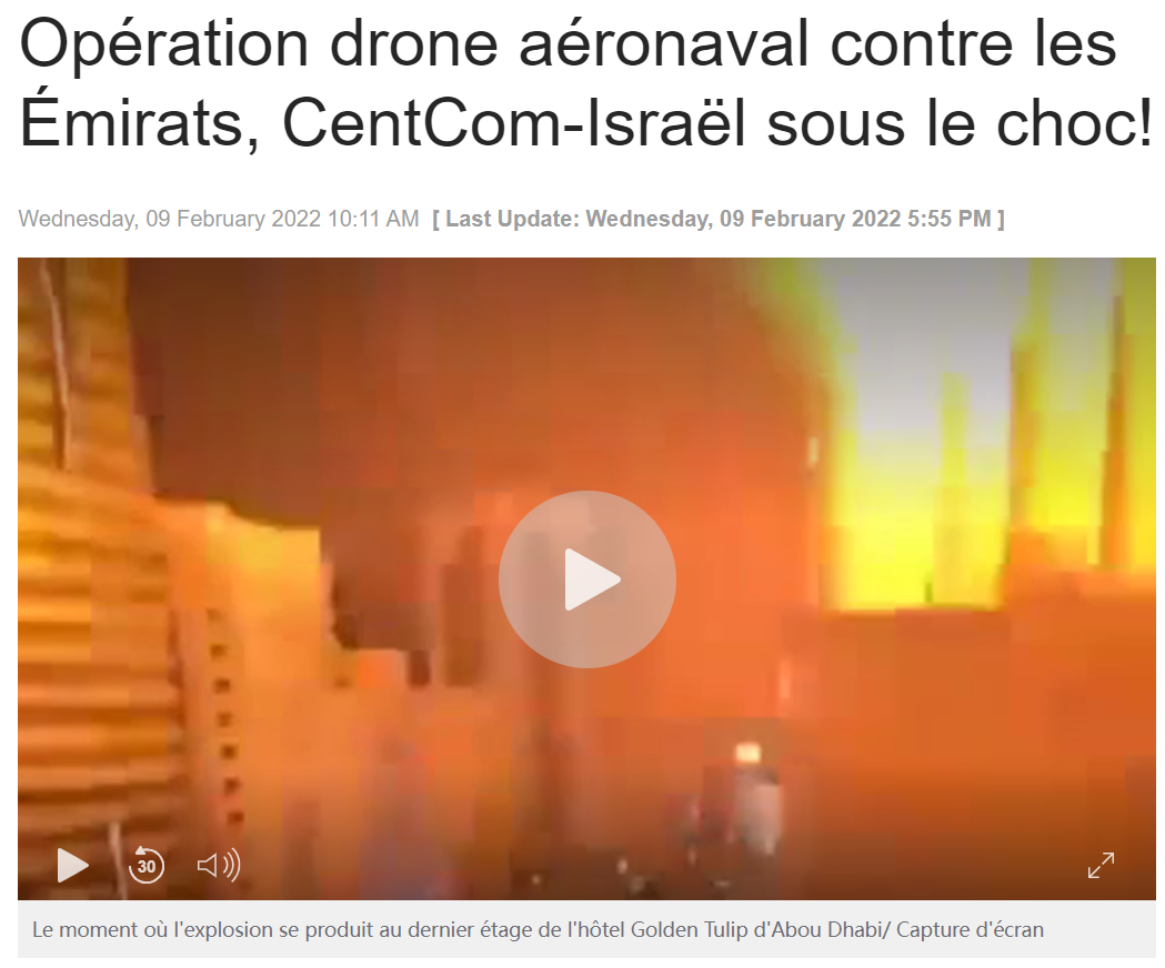 伊朗Press TV电视台是鲜有的几家直接引用爆炸现场视频的媒体。报道称,此次爆炸是由无人机导致的。这篇题为《空军无人机打击阿联酋行动,美国中央司令部和以色列被震惊了!》的报道从美国中央司令部总司令麦肯锡的采访写起,顾左右而言他,通篇未曾提及所谓“空军无人机”来自何方势力,不禁让人怀疑作者有哗众取宠之嫌。但是,文章提供了一则重要信息,即爆炸发生地为阿布扎比市中心的“金色郁金香”(Golden Tulip)酒店。