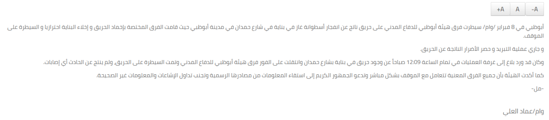 在谷歌上围绕关键词“انفجار أبوظبي”(爆炸 阿布扎比)搜索,并将时间限定在2022年2月9日之后。2月9日当天,阿联酋通讯社援引阿布扎比民防局(Civil Defense Authority)文件表示,哈姆登街一栋建筑物发生火灾,起火原因为煤气罐爆炸,报道发出时火势已经得到控制,未造成人员伤亡。民防局还呼吁广大公众“从官方渠道获取信息,避免散步谣言和假消息”。这则通告内的地点与“金色郁金香”酒店所在地吻合。