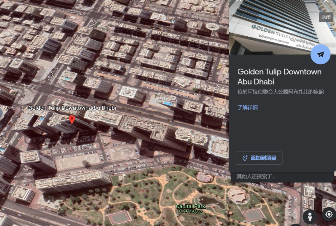 按照Press TV的说法,在谷歌地球上找到这家“金色郁金香”酒店进行印证。谷歌地球中该酒店的外观确实同视频中的高层建筑十分相似。谷歌地图信息显示,“金色郁金香”酒店位于德尔玛街(Delma St)和哈姆登街(Hamdan St)的交叉口。
