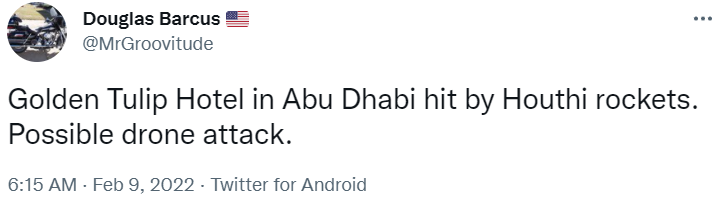 前些日子,有网友在社交平台上反映,阿联酋首都阿布扎比市中心遭遇火箭袭击,后引发两场爆炸。一则据称记录了袭击发生现场的视频在推特上传播。有网友表示,也门胡塞武装为此次袭击负责。