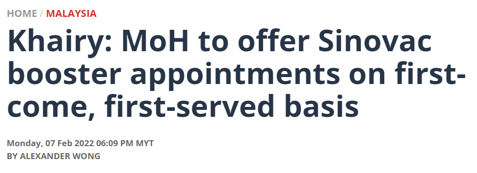 今年2月7日马卫生部的记者会上,凯里透露,全马境内共有350万完全接种科兴疫苗的人尚未接种加强针。凯里表示,卫生部将尽快开通科兴加强针预约通道,接种者“先到先得”。