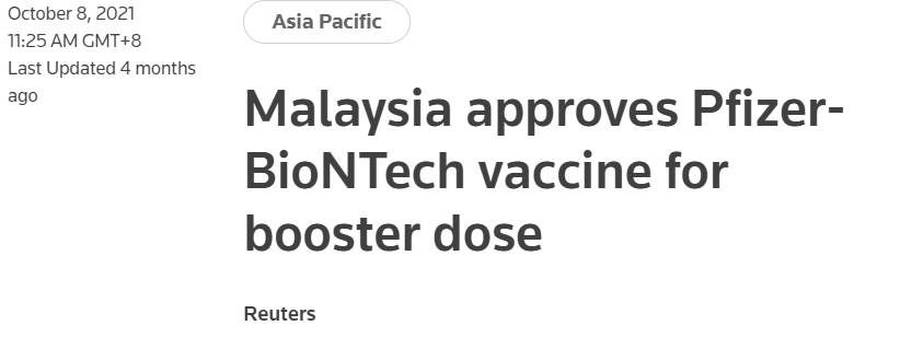 去年9月开始,马来西亚卫生部宣布启动加强针计划,为老年人和易感人群优先接种,并于10月批准辉瑞进入加强针计划。